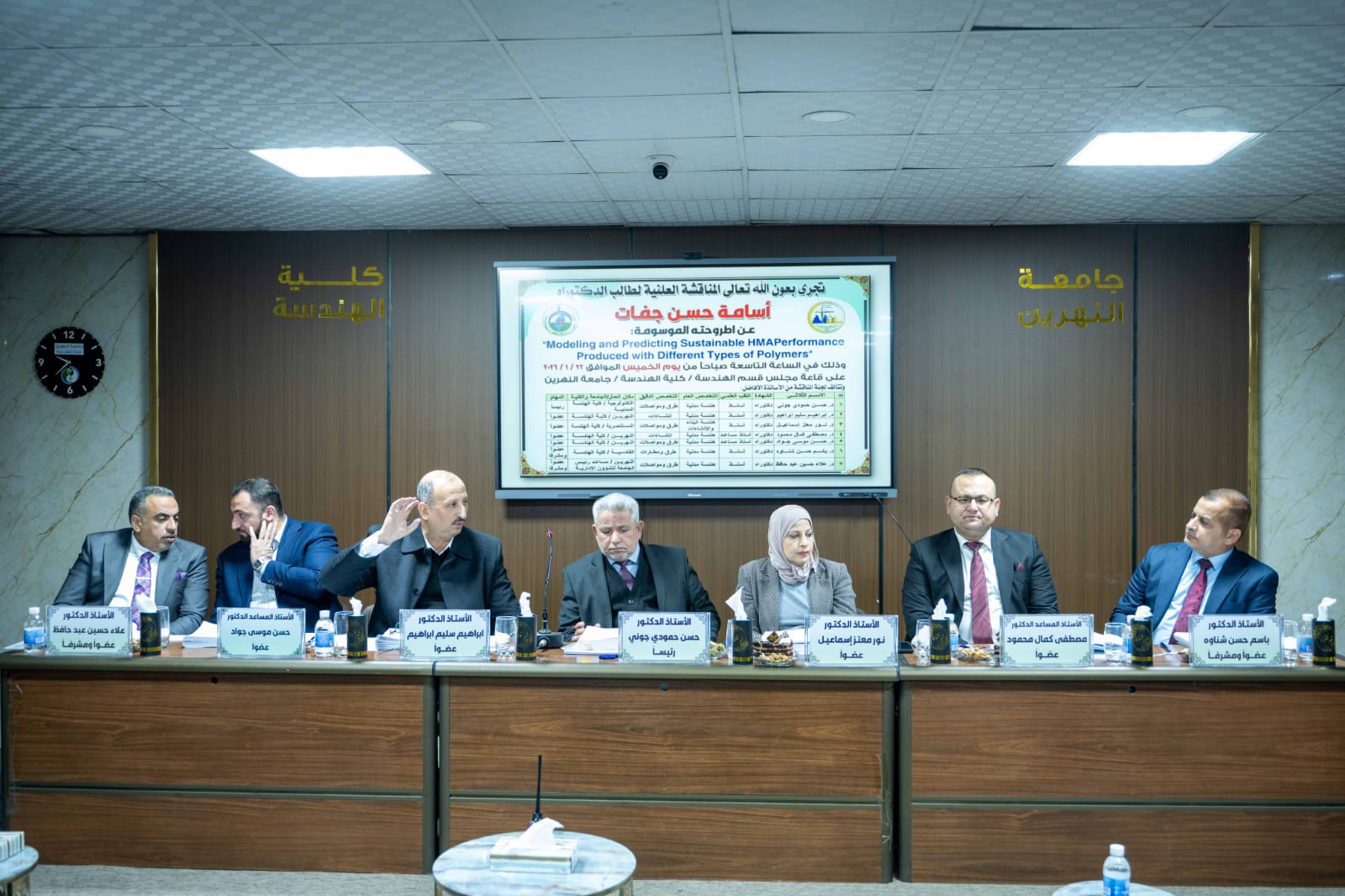 جرت في كلية الهندسة / جامعة النهرين مناقشة اطروحة الدكتوراه للطالب (اسامة حسن جفات) في اطروحته الموسومة: “MODELING AND PREDICTING SUSTAINABLE HM.....