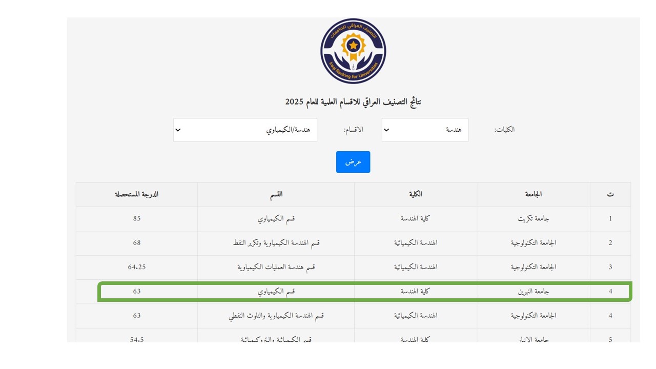 الكيمياوية في كلية الهندسة – جامعة النهرين المرتبة الرابعة بين أقسام الهندسة